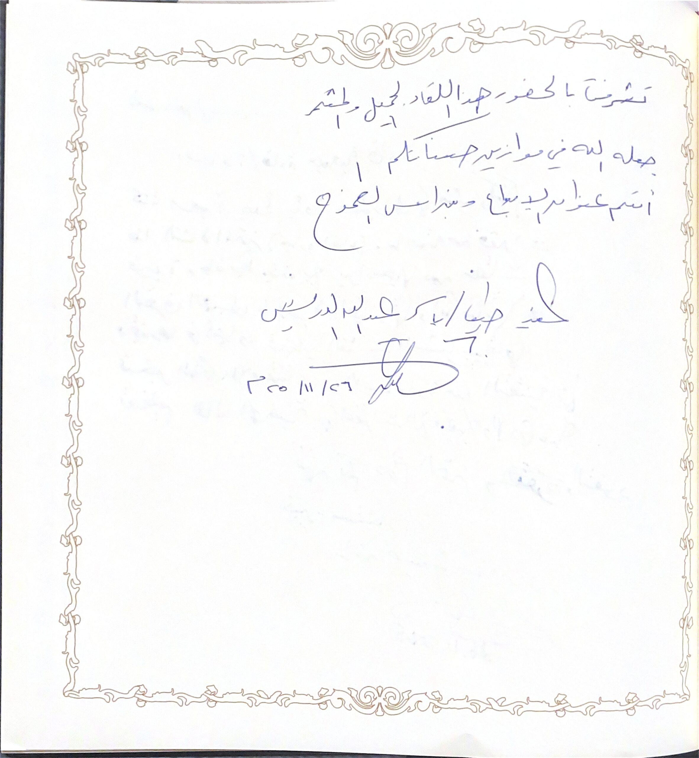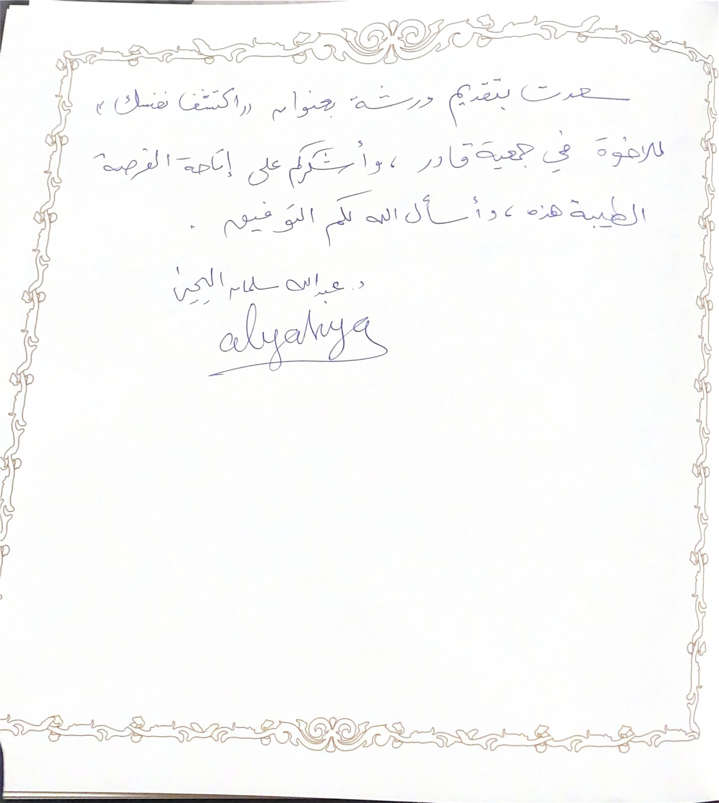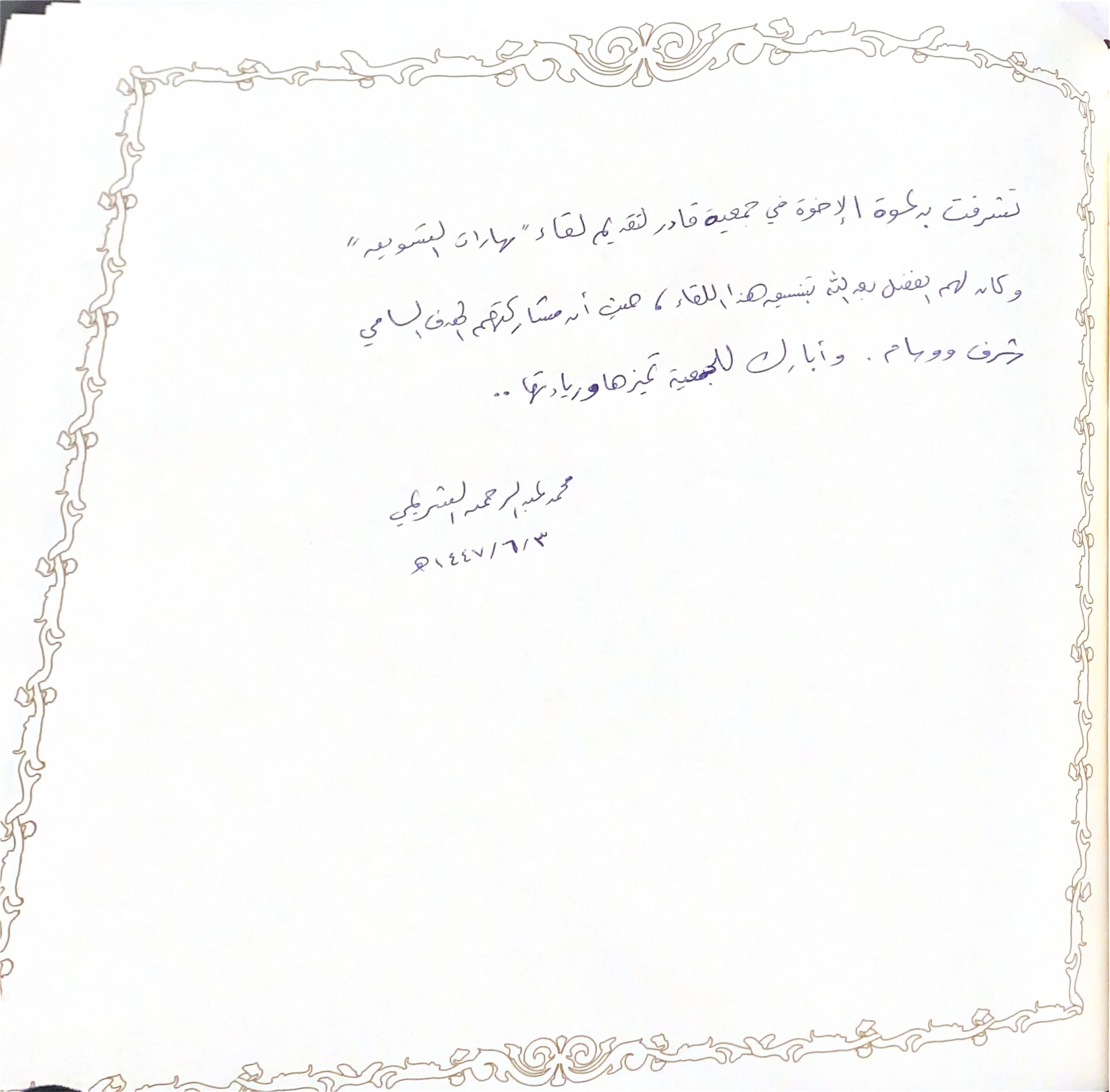 السادة قادة جمعية قادر كنت سعيد جدا بأول حضور لي ومشاركتكم هذا النشاط المتميز (مبادرة اخاء) وما حوته من فقرات فريدة وجاذبة بتنويع برامجها من حلقات التعرف العميق بالجمعية وانجازاتها وامكانياتها وتجذرها في أعماق قضايا الفئات الشبابية وتسخير الذكاء الاصطناعي والاستفادة من التقنية نتمى لكم دوام التميز والتفرد